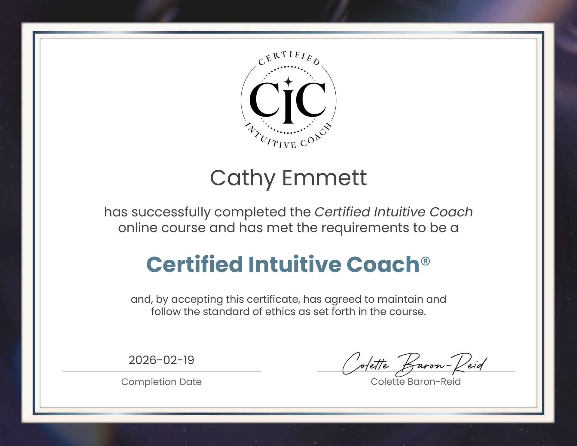 Cathy Emmett is proud to announce her achievement as a Certified Intuitive Coach.